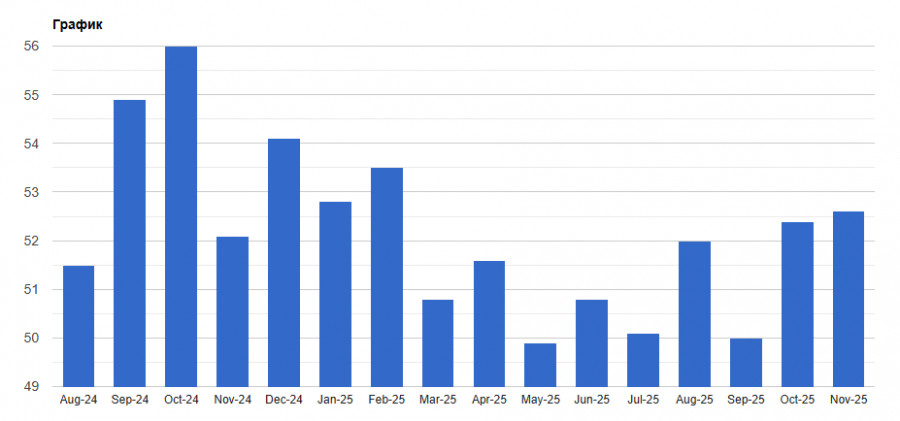 Согласно данным Института управления поставками, индекс вырос на 0,2 пункта, достигнув девятимесячного максимума в 52,6 пункта. Напомню, что значение выше 50 указывает на рост в большинстве секторов экономики.