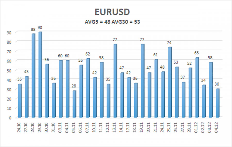 Средняя волатильность валютной пары EUR/USD за последние 5 торговых дней по состоянию на 5 декабря составляет 48 пунктов и характеризуется, как «средне-низкая». Мы ожидаем движение пары между уровнями 1,1611 и 1,1707 в пятницу. Старший канал линейной регрессии направлен вниз, сигнализируя о нисходящей тенденции, но по факту продолжается флэт на дневном ТФ. Индикатор CCI заходил в октябре в область перепроданности дважды(!!!), что может спровоцировать новый виток восходящего тренда 2025 года.