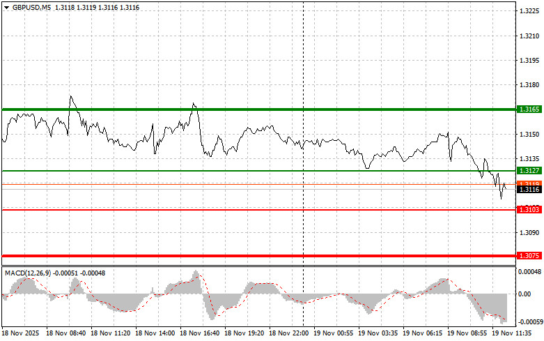 Kịch bản số 1: Tôi dự định mua bảng Anh hôm nay khi đạt điểm vào khoảng 1.3127 (đường xanh trên biểu đồ), nhắm đến mức tăng 1.3165 (đường xanh dày hơn trên biểu đồ). Gần 1.3165, tôi sẽ thoát các lệnh mua và mở các vị thế bán theo hướng ngược lại (dự kiến mức đảo chiều 30–35 điểm). Sự tăng trưởng của bảng Anh hôm nay chỉ có thể kỳ vọng nếu Fed thực hiện một chính sách ôn hòa. Quan trọng! Trước khi mua, hãy đảm bảo chỉ báo MACD nằm trên đường 0 và vừa bắt đầu tăng từ đó.