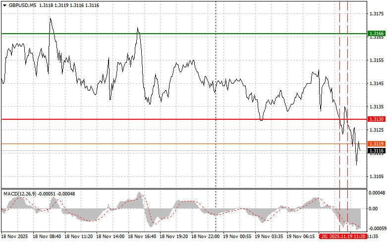 Kịch bản số 1: Tôi dự định bán bảng Anh hôm nay sau khi phá vỡ dưới mức 1.3103 (đường đỏ trên biểu đồ), điều này sẽ dẫn đến sự suy giảm nhanh chóng. Mục tiêu chính cho người bán sẽ là 1.3075, nơi tôi sẽ thoát các lệnh bán và ngay lập tức mở các vị thế mua theo hướng ngược lại (dự kiến một phản ứng lại 20–25 điểm). Áp lực lên bảng Anh sẽ trở lại nếu Fed áp dụng cách tiếp cận mạnh mẽ. Quan trọng! Trước khi bán, hãy đảm bảo chỉ báo MACD nằm dưới đường 0 và vừa bắt đầu giảm.